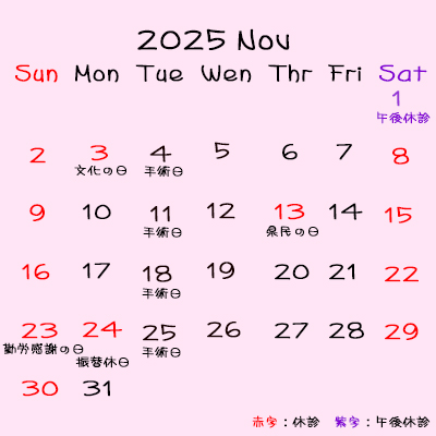 11/8(土),11/13(木),11/15(土),11/22(土),11/29(土)休診